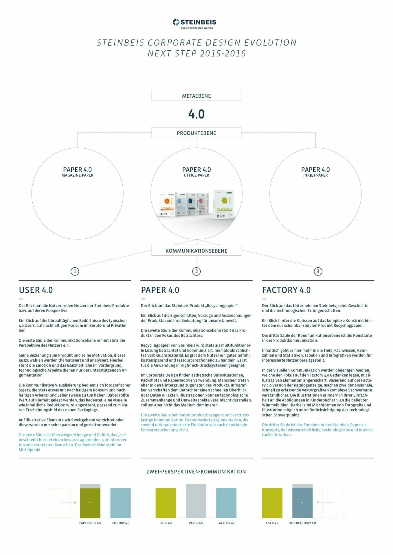 Die strategische Ausrichtung der gesamten Kommunikation verschob den Fokus von „ökologisch“ auf „Vertriebs- und Nutzenkommunikation“ und betonte zugleich den technologischen Hintergrund. Die Paper 4.0-Ausrichtung positioniert das Produkt vor dem Hintergrund des „digitalen Wandels“ (Stichwort: Industrie 4.0). Gestaltung und Bildwelt wurden dadurch weniger „grün“ und stattdessen cleaner und klarer. Grafische Elemente wie Perforationslinien oder Labels wecken Papierassoziationen, die Farbe „Weiß“ dominiert.