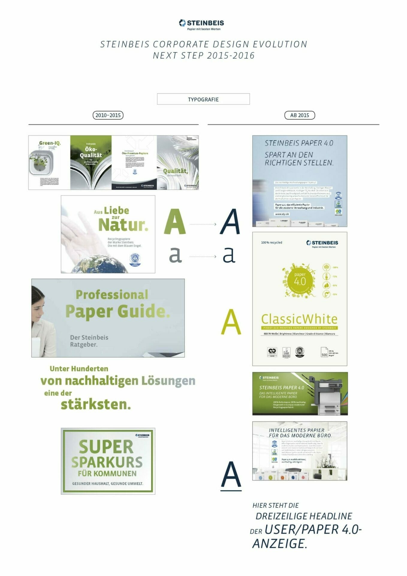 Im Auftrag von und in Zusammenarbeit mit der Goodmen Group München konzipierte Morlock Design den „next step“ der Steinbeis Corporate Design Entwicklung. Der Recyclingpapierproduzent aus Glückstadt in der Nähe von Hamburg veränderte die Ausrichtung seiner Kommunikation und verjüngte sich im Zuge dessen auch visuell. Ausgangspunkt der Weiterentwicklung war das jüngst überarbeitete Packaging-Design, welches sich im Vergleich zum Vorgänger zeitgemäßer, luftiger und frischer präsentiert und damit auf der Höhe der Zeit angekommen ist.