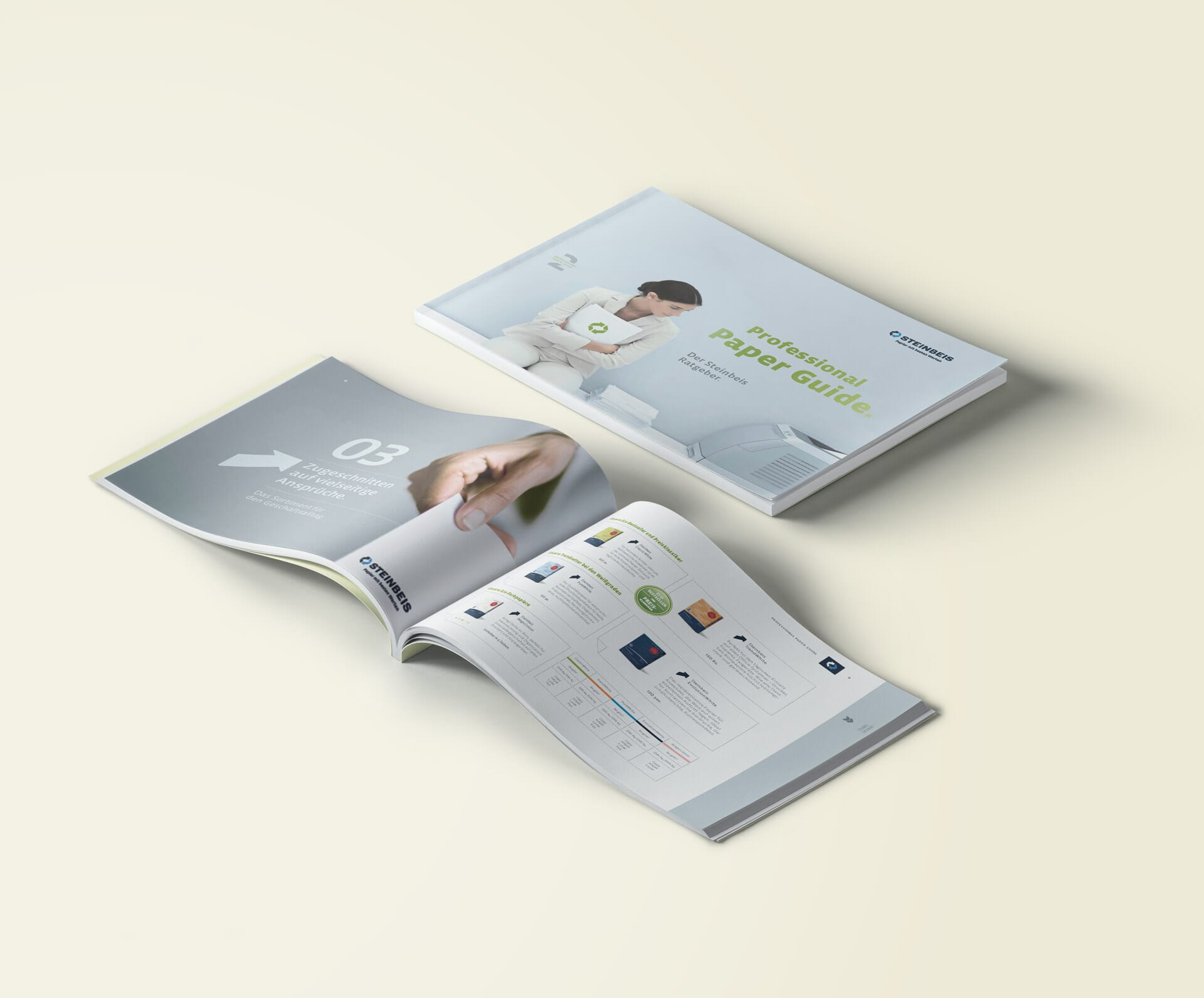 Der Steinbeis Professional Paper Guide ist Teil 2 einer Doppelausgabe in deutsch und englisch, zusammen mit der Steinbeis Brand Broschüre. Image und praktische Anwendung, ansprechend gestaltet in einem Schuber aus Karton.
